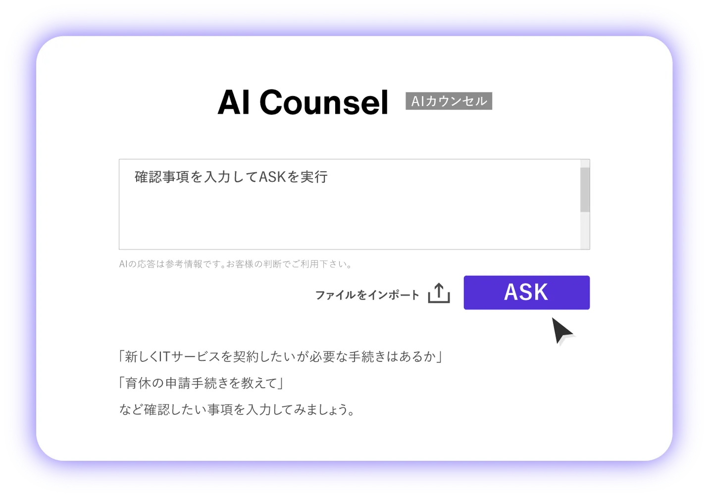 管理部門に相談する前に、事業部門の担当者はまずAIカウンセルで確認。「ASK」で知りたいことを瞬時に確認できます。これによりコーポレートナレッジ部門は問い合わせにかかる1日約210分*の工数を削減することができます。