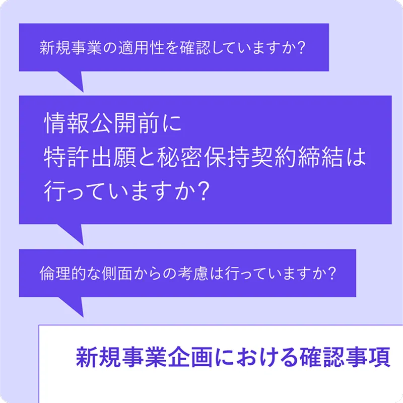 新規事業や施策の検討時に見落としがちな法的リスクや、契約・知財・個人情報・独禁法などの論点を“気づき”として提示。