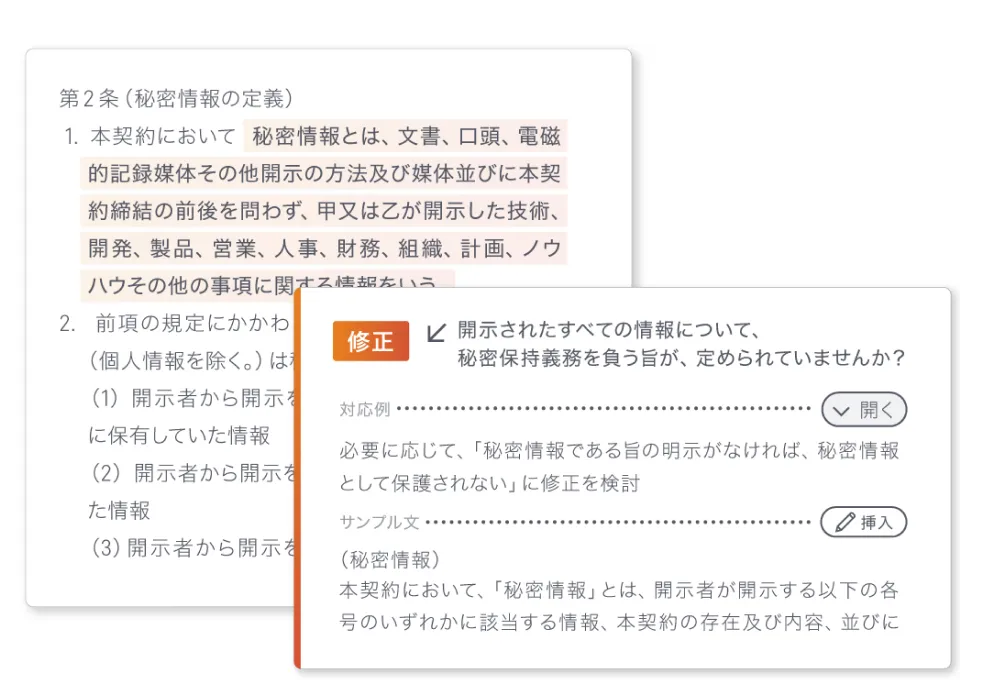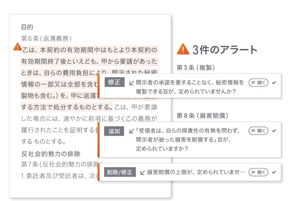 AIが瞬時にチェック項目を表示・該当条文をハイライトするので、論点をすばやく把握。