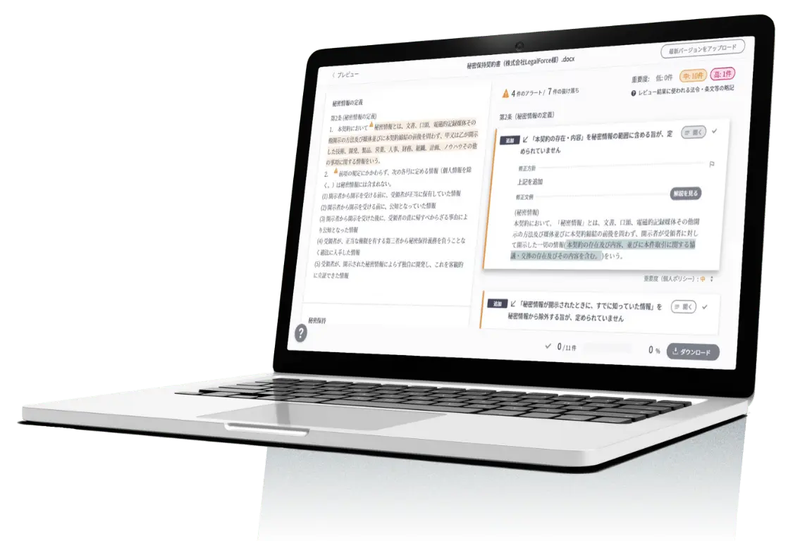 最新の法改正に対応したAIが、一瞬で契約リスクの洗い出しをサポート。日英合わせて70種類以上の契約書に対応しています。