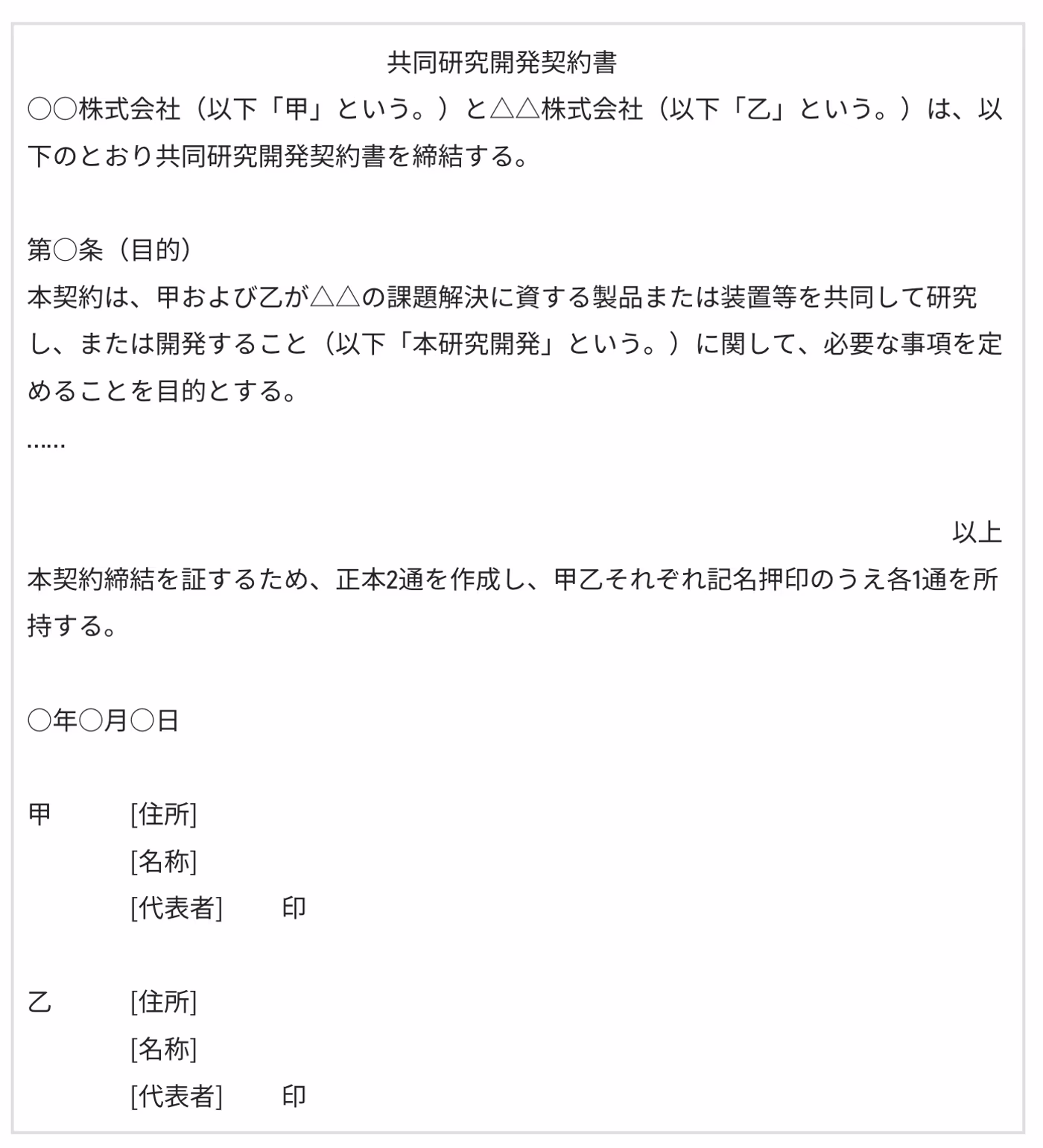 - 本契約は、甲および乙が△△の課題解決に資する製品または装置等を共同して研究し、または開発すること(以下「本研究開発」という。)に関して、必要な事項を定めることを目的とする。