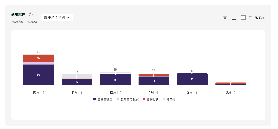 「誰がどの案件を抱えているか把握しづらい」といった管理上の課題に対応する機能として、「CLMレポート」の提供を開始しました。蓄積された案件データをもとに、案件数や処理時間などを可視化することで、データに基づく組織運営を支援します。