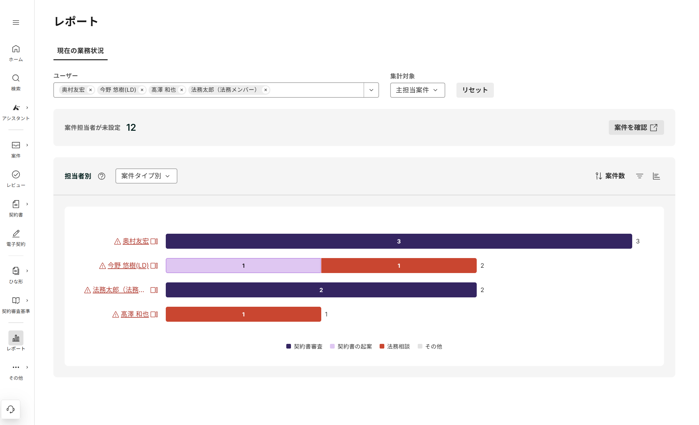 担当者ごとの案件数や負荷状況を把握しやすくなります。特定の担当者への業務集中や対応遅延の兆候を早期に把握し、状況に応じた案件配分や人員配置の検討に役立てられます。 - 状況の早期把握と対応検討を支援