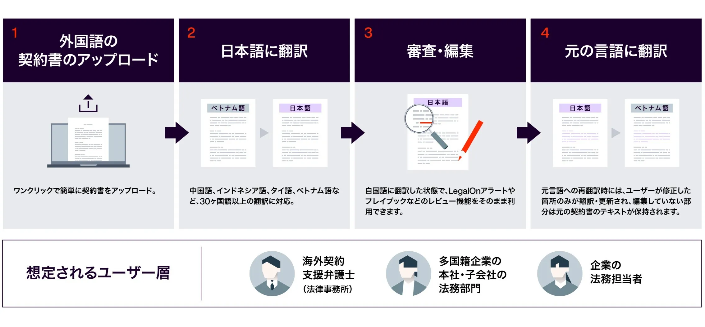 本機能は、海外企業との契約を取り扱う企業の法務部門や専門家など、外国語契約書のレビュー業務に携わる幅広いユーザーの実務を支援します。多国籍企業の本社や海外子会社における契約レビュー業務のほか、海外取引を行う企業におけるリスク確認や契約内容のチェックなど、さまざまな場面での活用が想定されています。