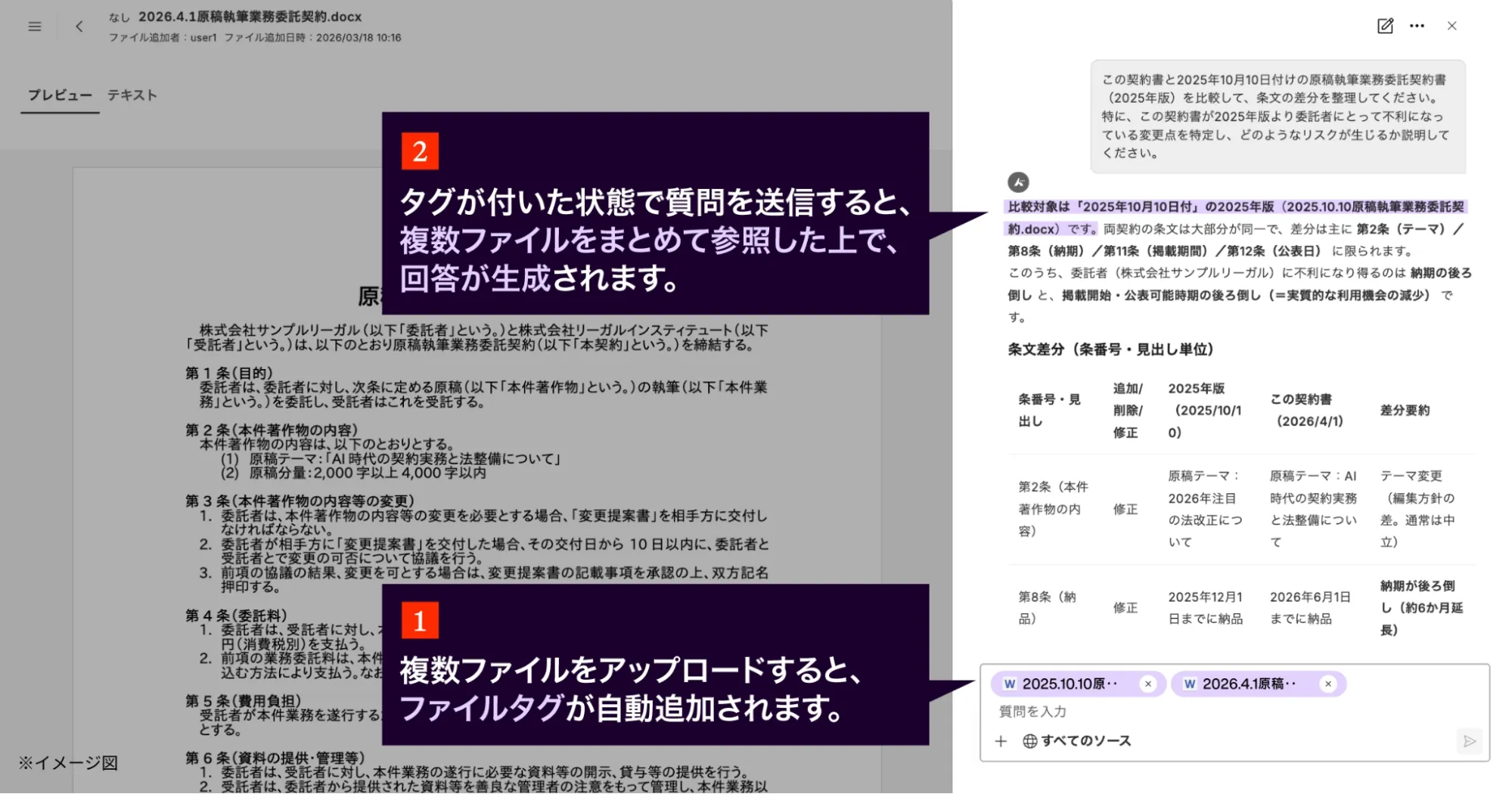 これにより、契約書同士の比較や、契約書と社内ガイドラインなどの関連資料の照合を、1つの会話内で効率的に実施できます。