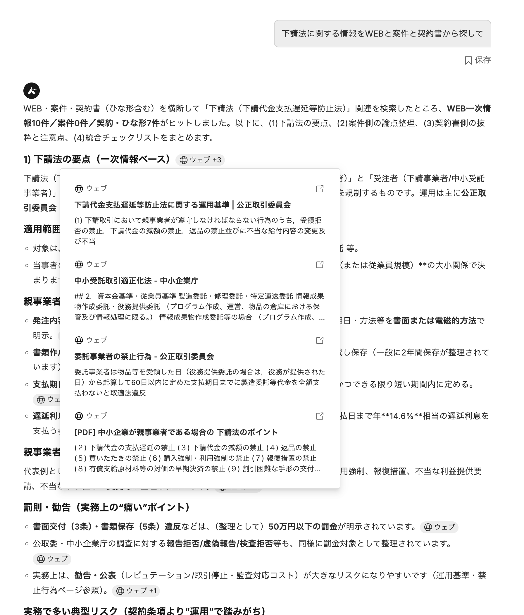 さらに、引用箇所にカーソルを合わせることで、「出典タイトル」や「ソース種別」を確認できるプレビューカードが表示されます。 回答のどの部分がどの情報に基づいているのかが直感的に把握でき、「回答確認から根拠確認まで」をシームレスに行える点が大きな特長です。.png)