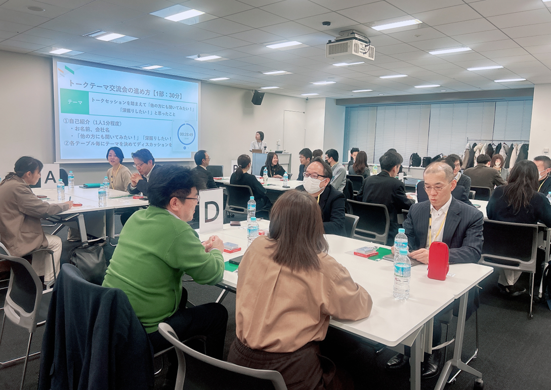 交流会は途中で席替えを挟んだ2部構成で進行。第1部ではトークセッションの内容を踏まえた意見交換を行い、第2部ではテーブルごとに設定したテーマに沿って、より具体的な情報交換が行われました。