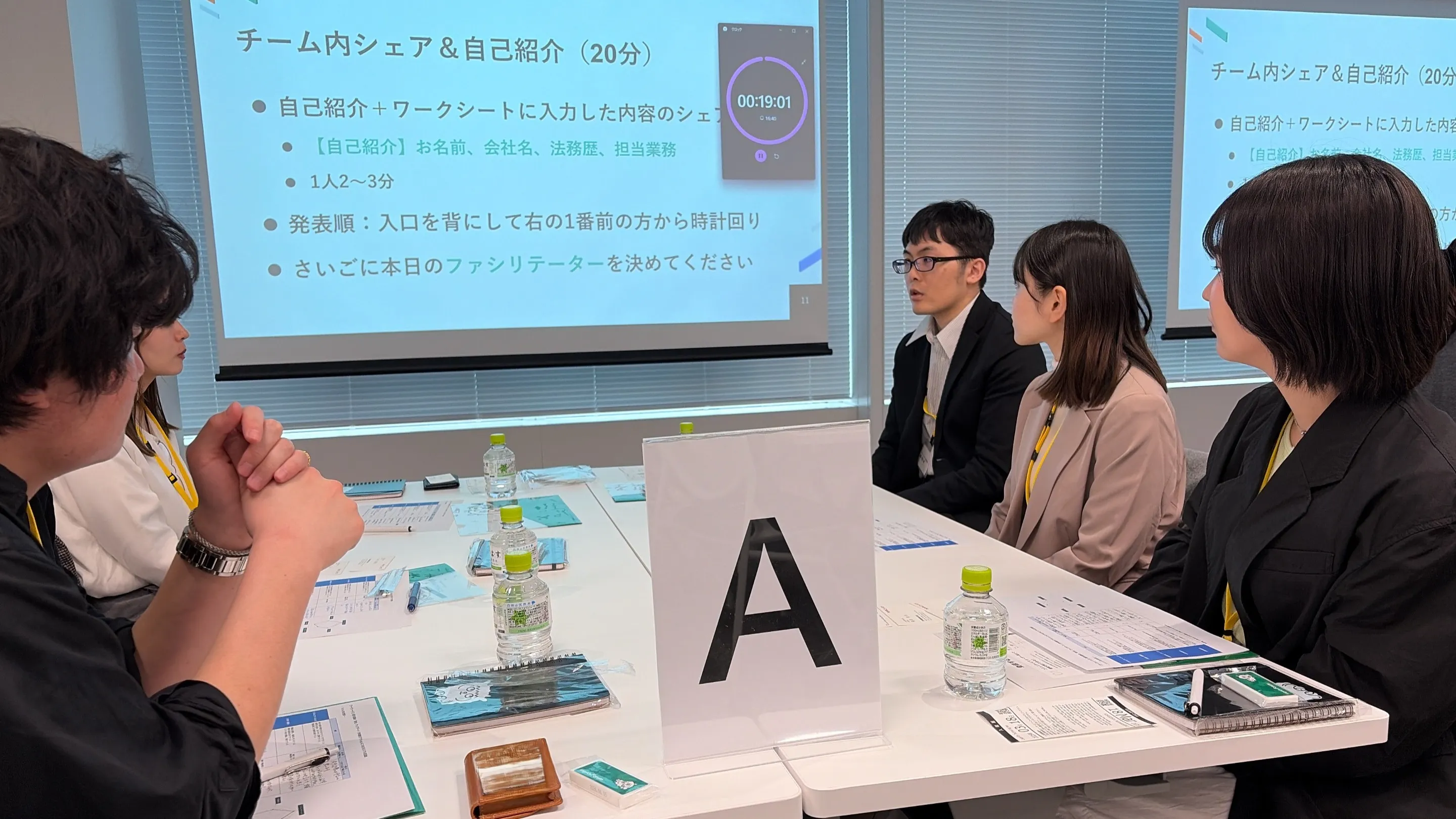 個人ワークで各自振り返りをおこなった後は各テーブルごとにディスカッションを実施。自己紹介を兼ねて現在の法務歴や担当業務を共有した後、個人ワークで整理した内容をもとに、自身が目指すスキルアップの方向性や考えていることなどをシェアしました。
