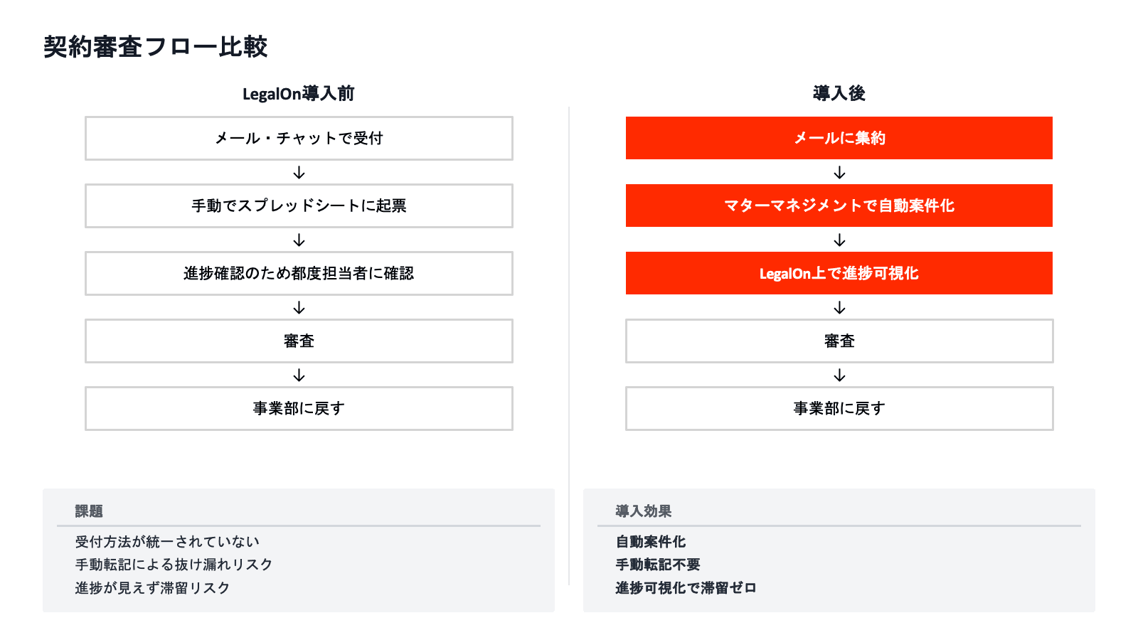 - 法務課題:メールやチャットで分散した契約審査受付と手動管理による抜け漏れ・滞留リスク、進捗把握の属人化