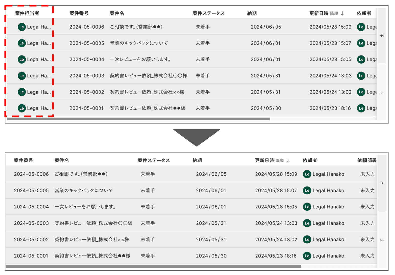 また、以前は手動での管理や進捗確認が大きな負担となっていましたが、現在は全案件のステータスがLegalOn上で一覧でき、可視化されました。滞留案件も一目で把握でき、リマインドもLegalOn上で行えるので、管理効率は格段に上がりました。