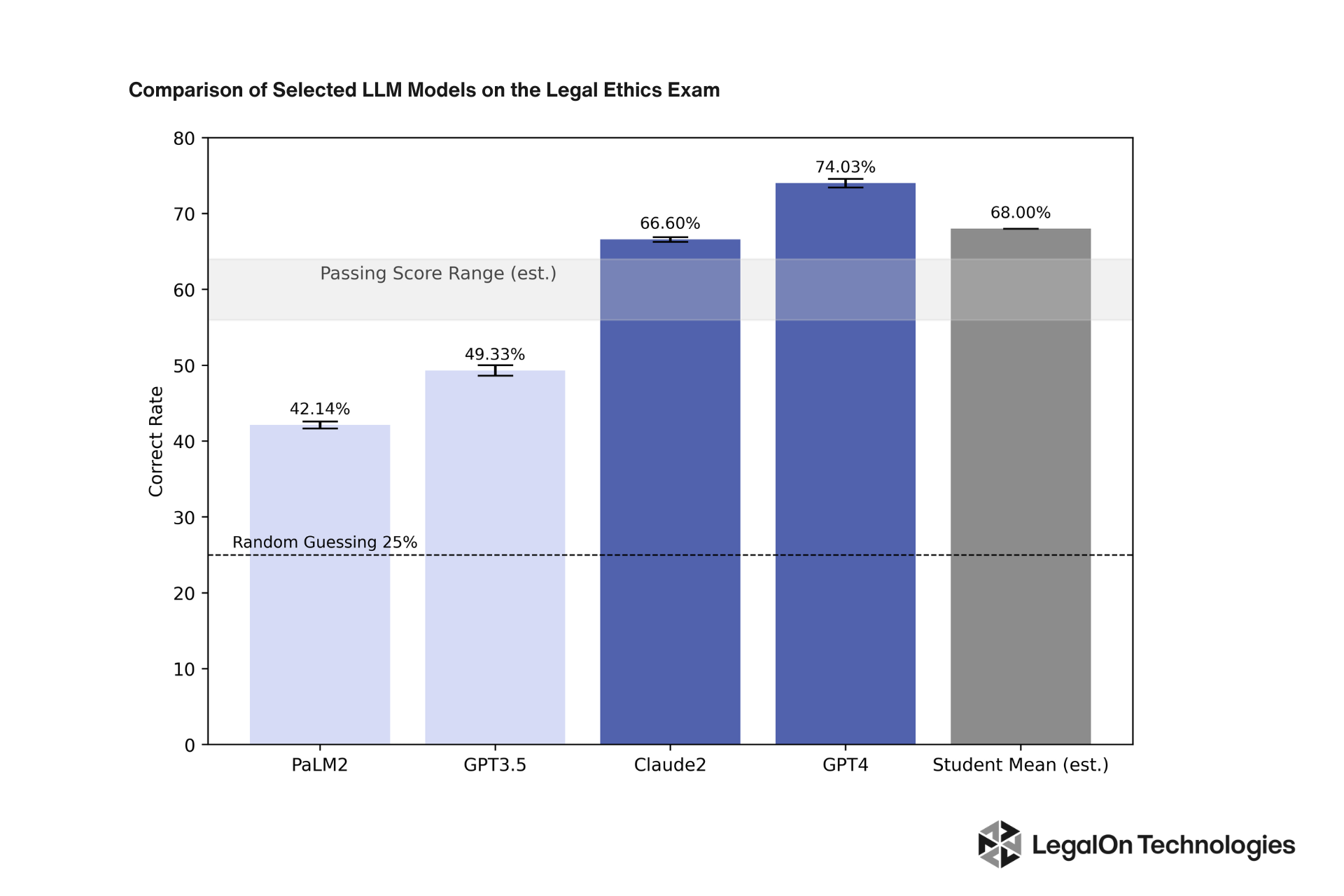 In an exciting development within the field of legal technology, our team at LegalOn Technologies has conducted a study with significant implications for the future of AI in law. We found that leading generative AI models, including OpenAI's GPT-4 and Anthropic's Claude 2, have the capability to pass the legal ethics exam, a requirement for lawyers in the United States alongside the bar exam. This achievement highlights the potential of AI in assisting with legal work and showcases the advanced capabilities of large language models in the field of law.