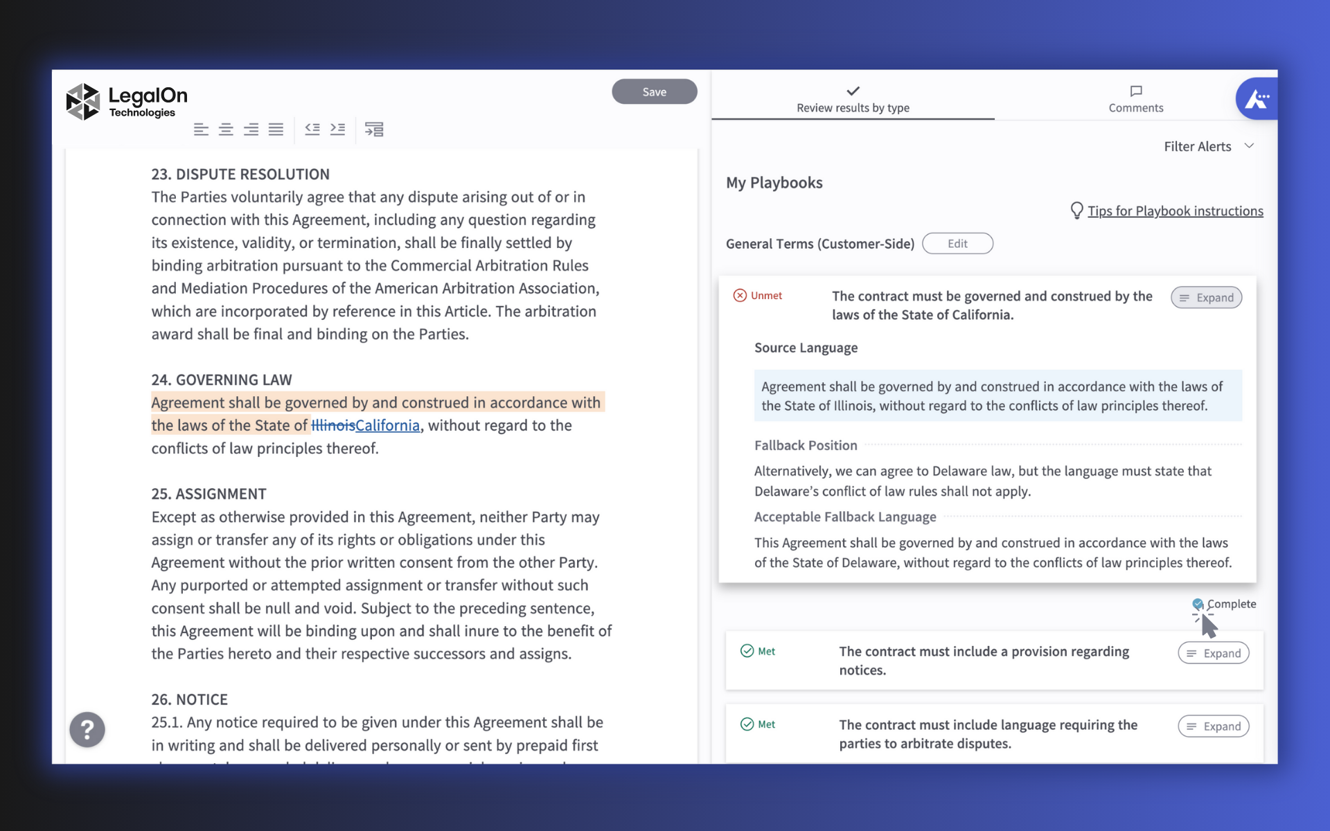 “Legal teams spend countless hours reviewing contracts for the same issues, like indemnification, limits on liability, and payment terms," said Daniel Lewis, Global CEO of LegalOn Technologies. “My Playbooks solves this by automatically spotting problematic terms and revising them. It’s easy to use, and remarkably powerful.”