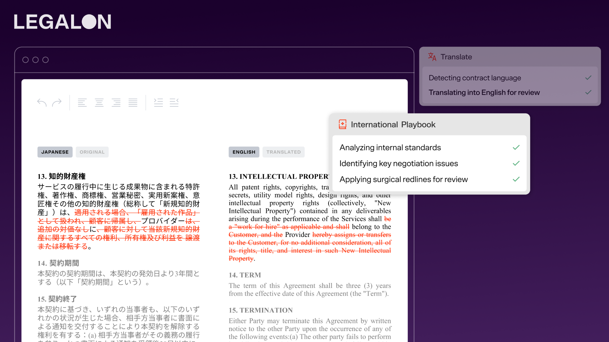SAN FRANCISCO (April 7, 2026) — LegalOn Technologies, a global leader in legal AI, today announced International Playbooks, providing review standards across 23 countries, and Translate, an AI translation solution built for multilingual contract review and negotiation — giving in-house legal teams the tools to work across jurisdictions and languages without defaulting to outside counsel.