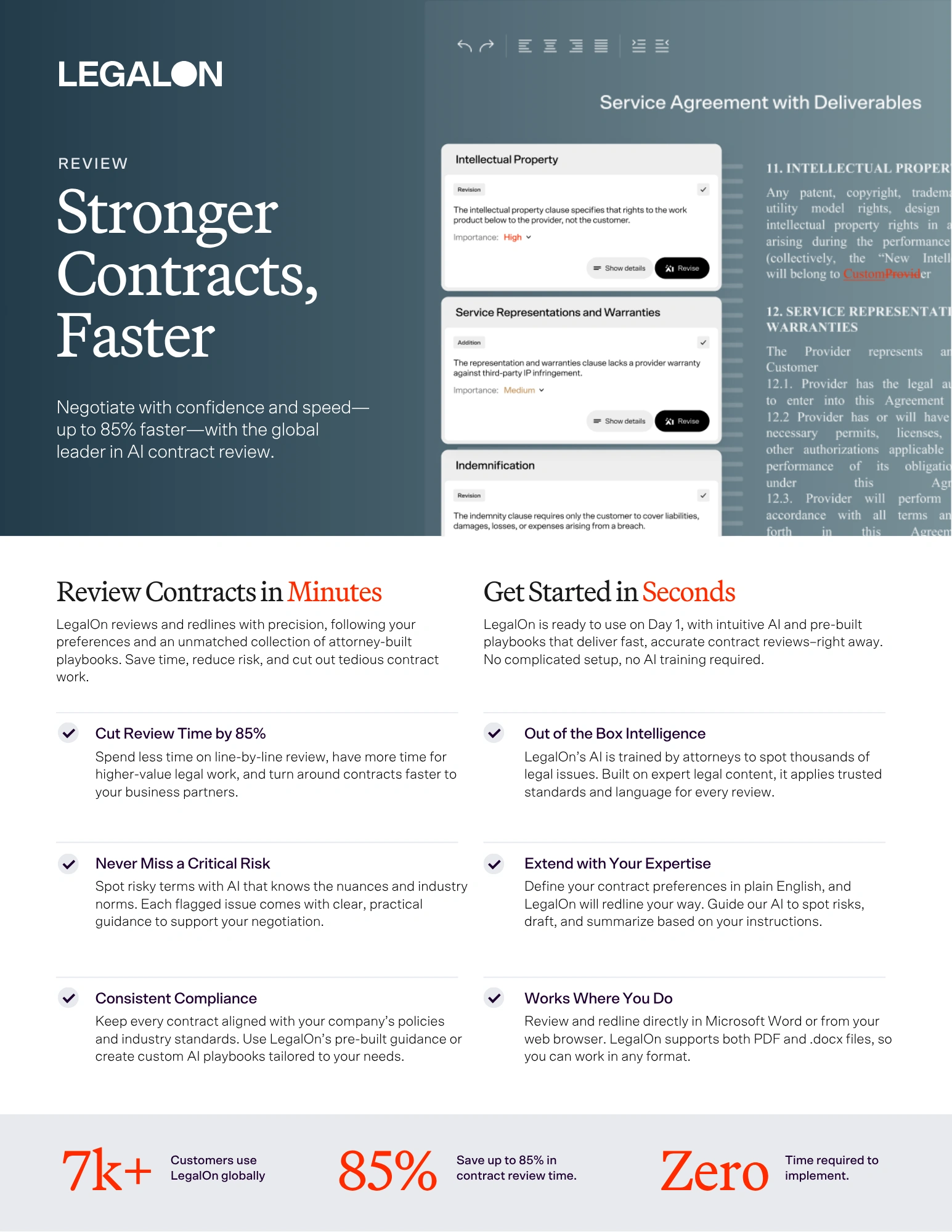 LegalOn's AI contract review software is fast, thorough, and reliable. LegalOn integrates advanced AI technology with attorney-crafted playbooks, turning hours of contract review into mere minutes. Download this product sheet to explore LegalOn's functionality and benefits: